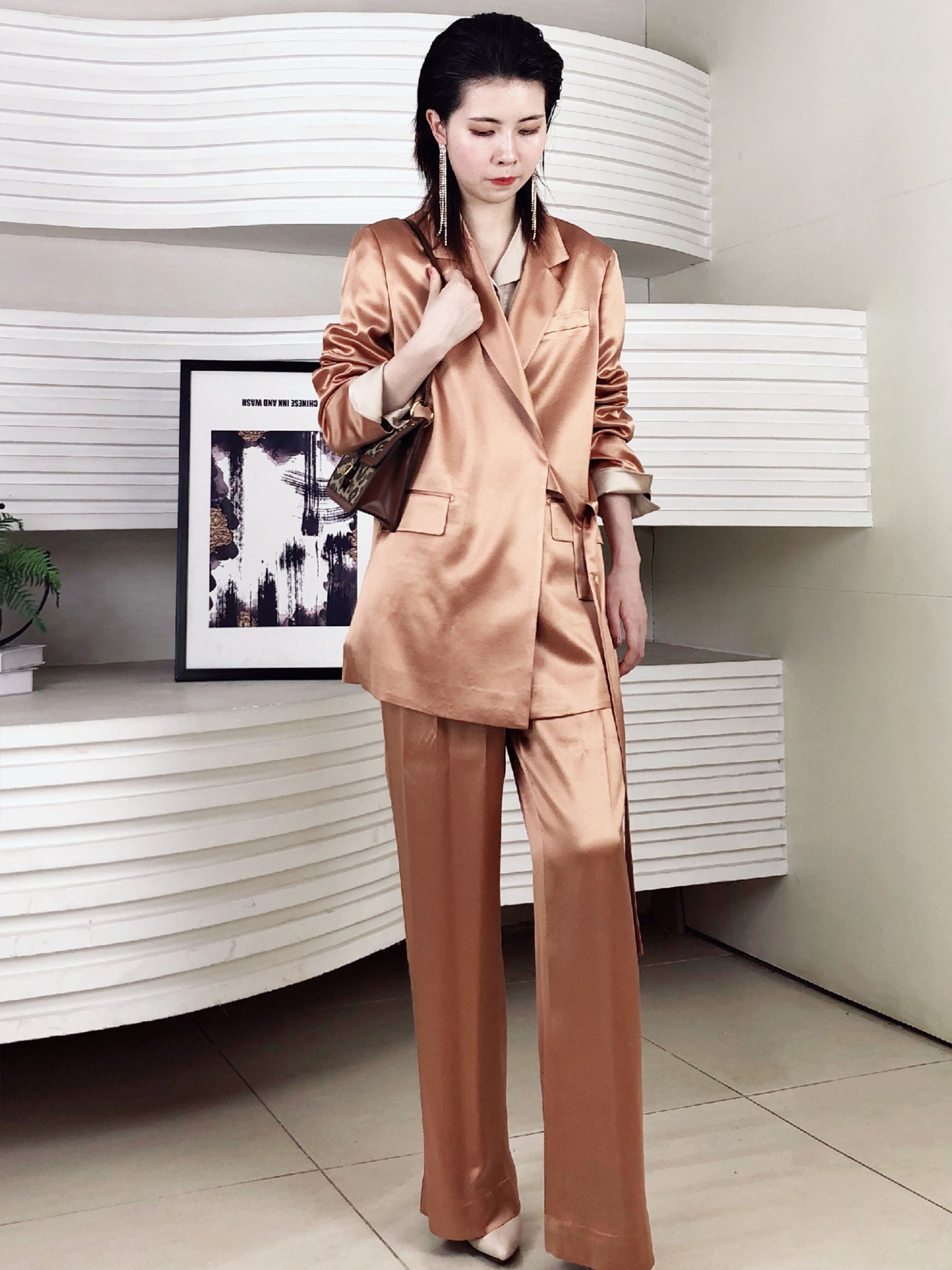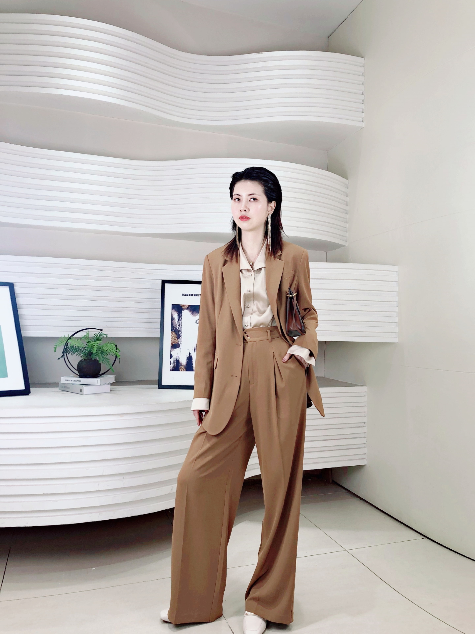 卡其色醋酸氣質(zhì)女生范寬松西裝套裝